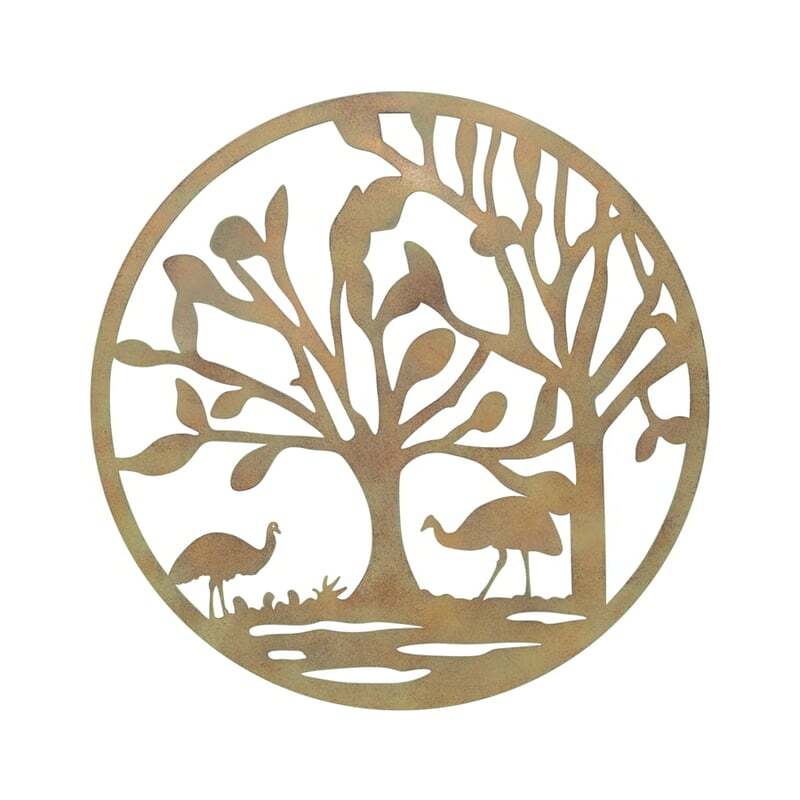 Add charm to any room or hallway wall with this stunning Laser-Cut Emu Wall Art featuring emus, trees, and nature in a distressed green finish. A good addition to any home decor - decorate your home entrance, any rooms, or hallway. A hook is included on the back of this round wall art to make this piece ready to hang.