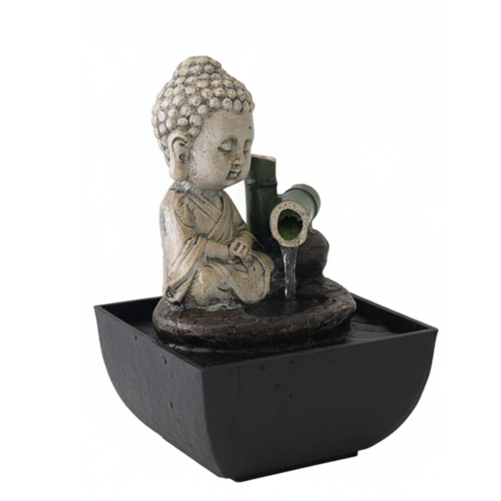 A truly charming and lighthearted piece, the Willow & Silk Baby Monk fountain depicts a young, cheerful monk in a playful pose. Water gently trickles around the figure, creating a soft, happy sound. This fountain brings innocence and joy to any setting.
