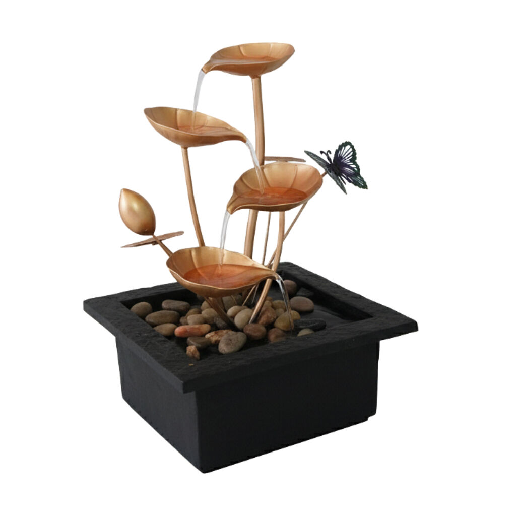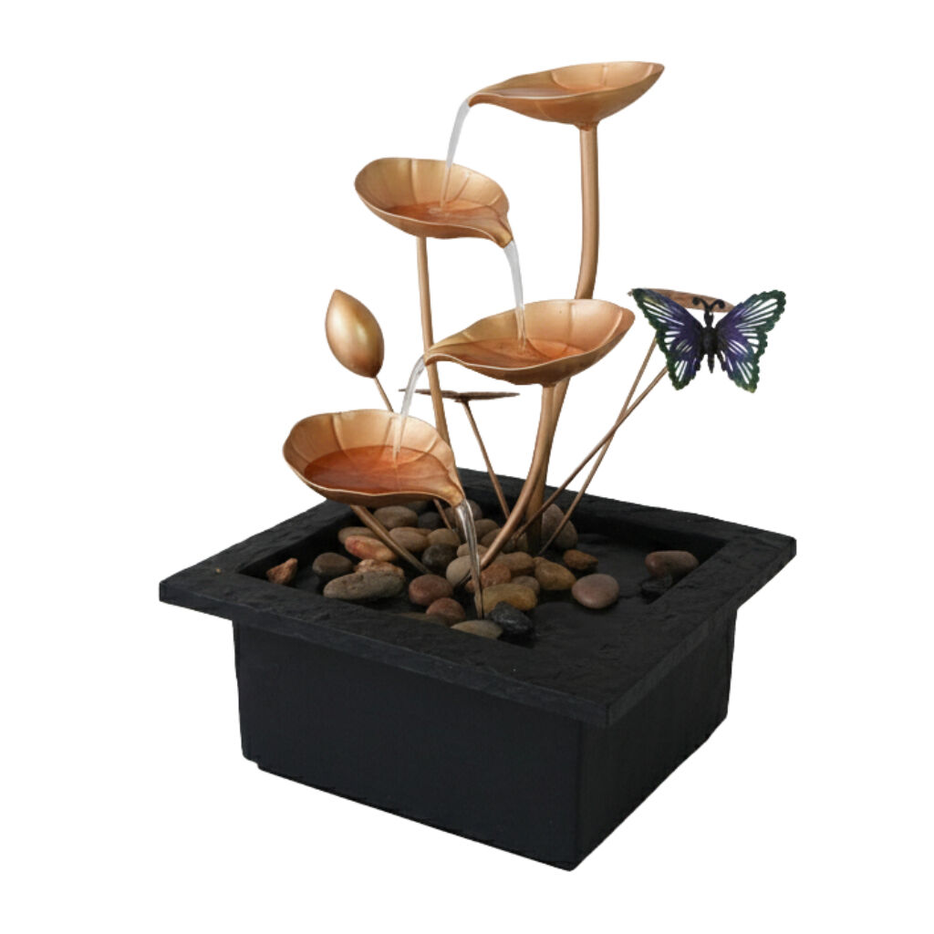The delicate Willow & Silk Butterfly Lily fountain showcases a butterfly perched on a large water lily, bringing an element of elegant, natural beauty to your home. The gentle overflow from the lily pad creates a soft, tranquil sound.