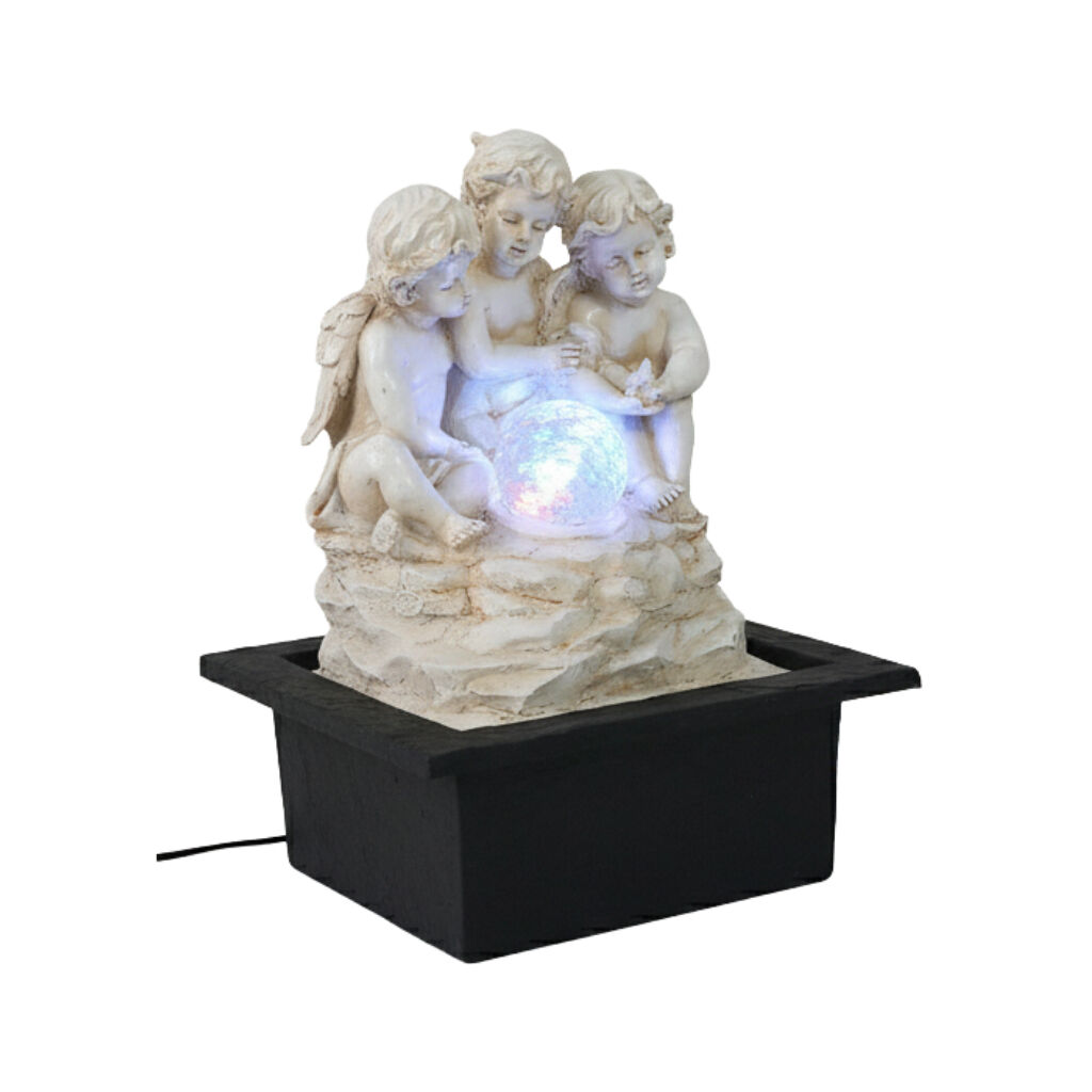 The Willow & Silk Cherub Angels 23x20x28cm fountain is a grand and charming feature, depicting two sculpted cherub figures happily directing the flow of water around a decorative basin. The gentle splashing sound evokes a sense of classical peace and lighthearted grace.