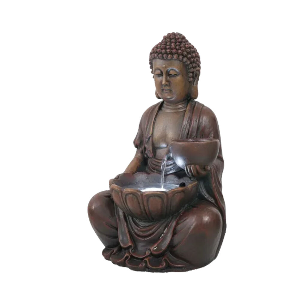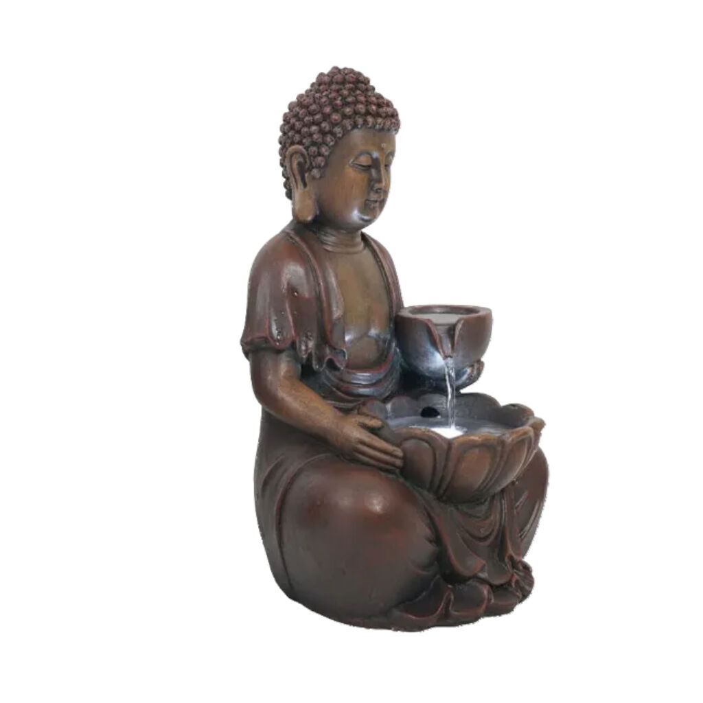 The Willow & Silk Décor Buddha fountain is a sleek, modern piece featuring a small, stylized Buddha figure. Water runs down a minimalist rock face, combining spiritual serenity with contemporary design.