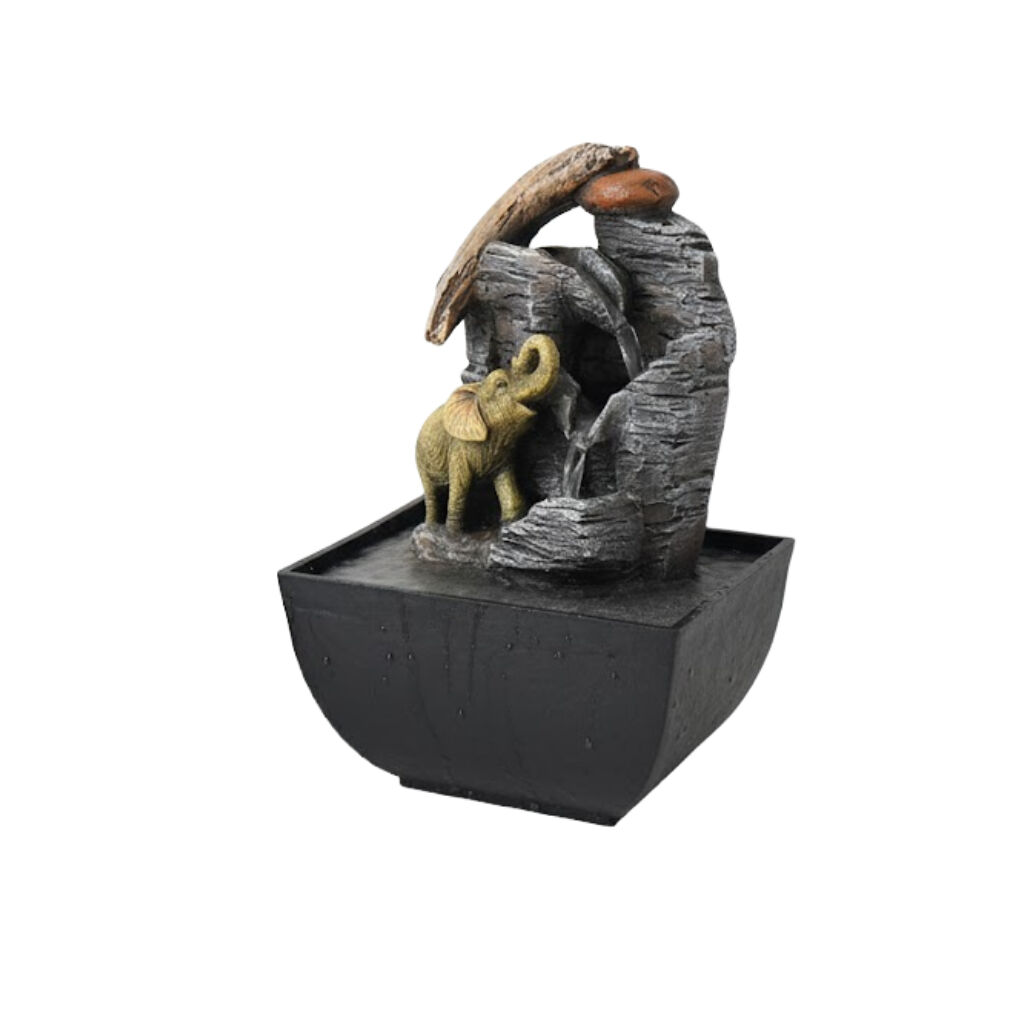 Symbolizing strength, wisdom, and good fortune, the Willow & Silk Elephant Trickle fountain features a small, dignified elephant figurine near a gentle water flow. The water softly cascades over the rock formation, offering a quiet, deep sound that reinforces the feeling of grounded power.
