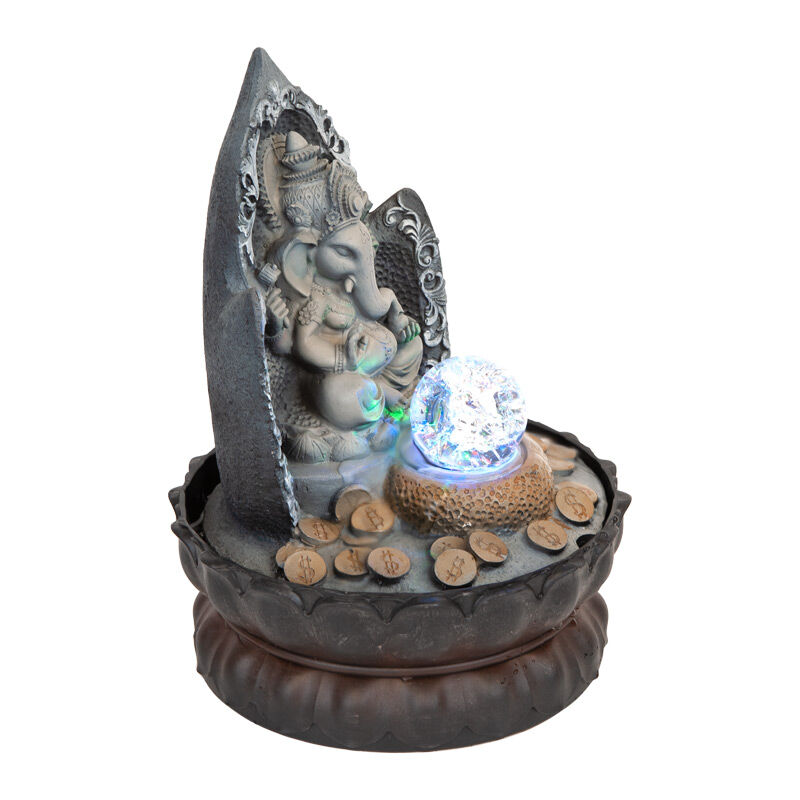 A tranquil blend of spiritual focus and natural flow is the Willow & Silk Ganesha Drift 21x21x29cm fountain. The Ganesha figure is seated next to a cascade of smooth, tiered stones where water gently 'drifts' and pools, creating a continuous, soft burbling sound reminiscent of a mountain stream.