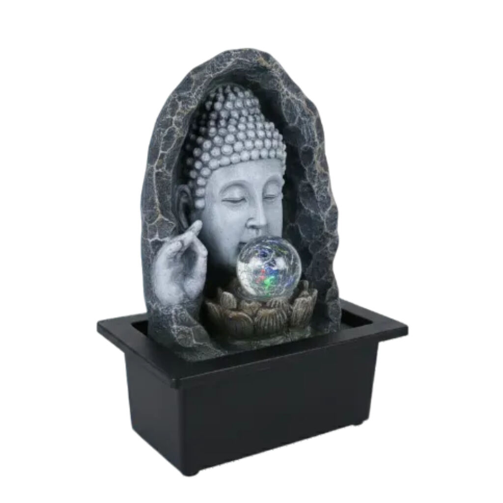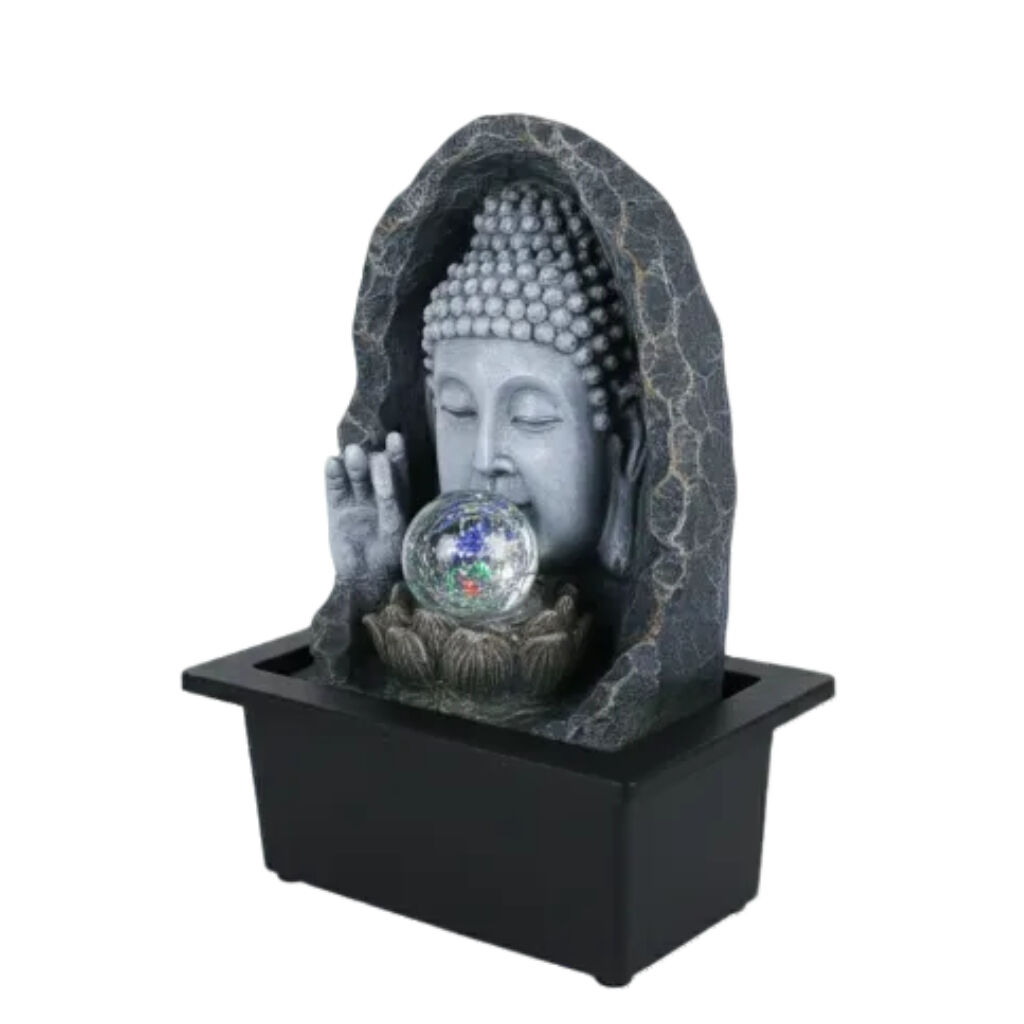 A compelling piece that captures a moment of deep, quiet focus is the Willow & Silk Gazing Buddha 24x18x27cm. The Buddha figure is positioned with a clear, reflective basin of water at the base, creating a visual mirror effect. A subtle water flow adds a gentle, calming sound to the contemplative scene.