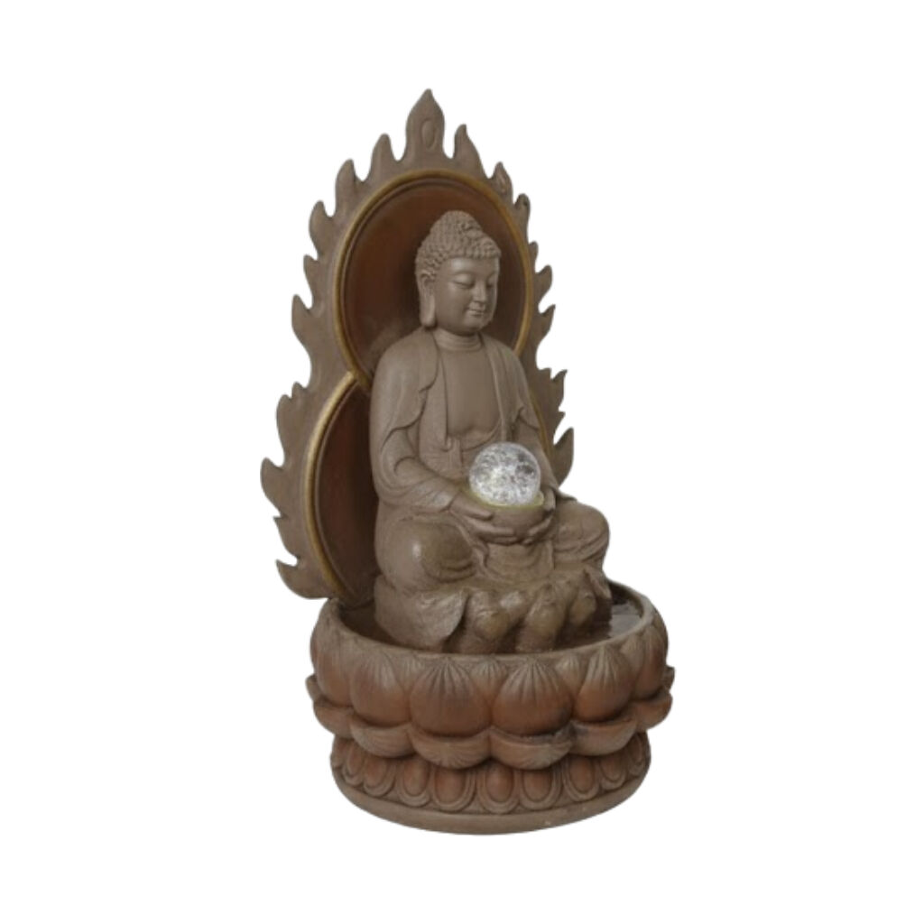 The Willow & Silk Glorified Buddha fountain features a stunning Buddha figure with water pouring from a lotus, creating a continuous, beautiful stream. This piece is ideal for bringing a serene yet rich aesthetic to your space.