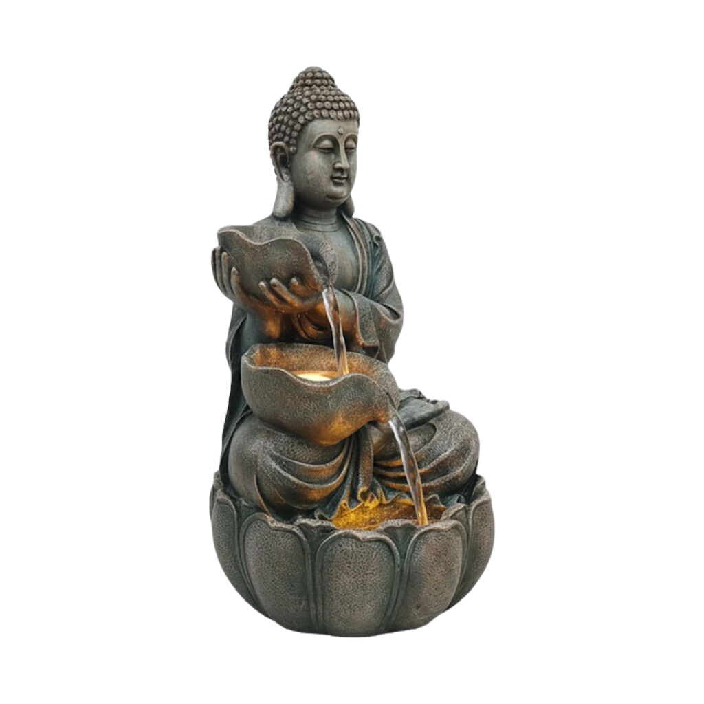 The stately Willow & Silk Grand Buddha fountain features a large, serene Buddha figure in a meditative pose. The continuous, quiet flow of water is an immediate source of calm, making it a powerful centerpiece for relaxation.
