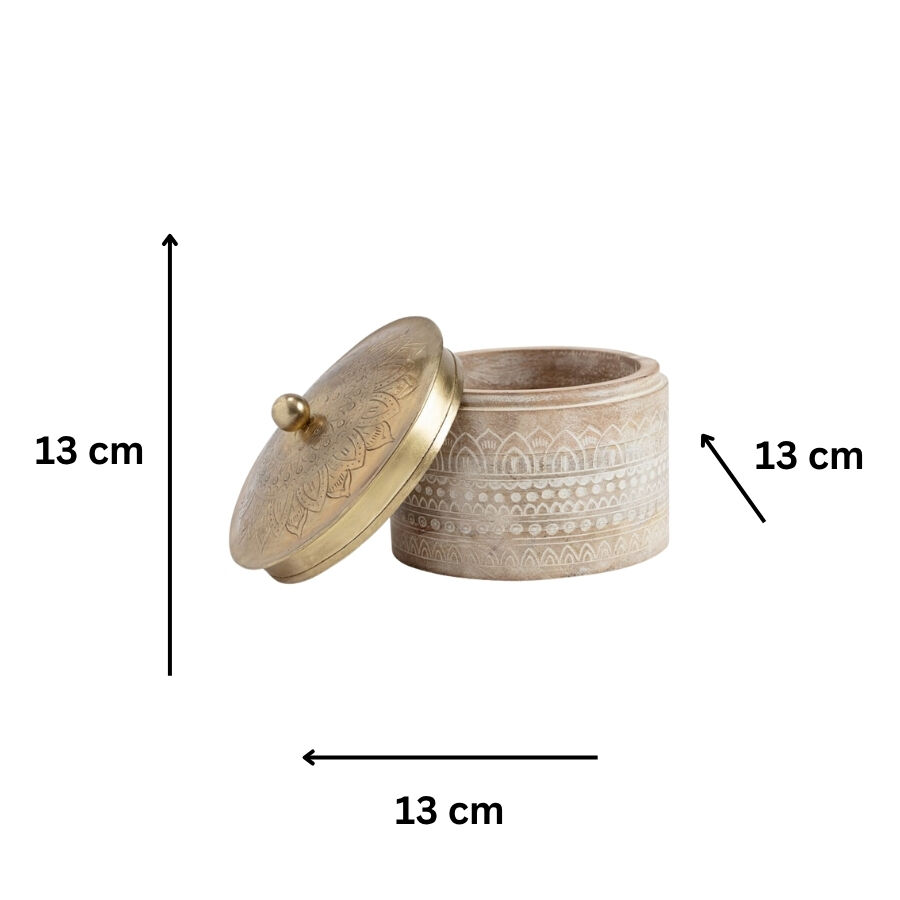A beautiful, versatile medium-sized round wooden box with pressed metal lid which can be used for storage, packaging, jewellery, etc. Hand crafted by Indian artisans with decorative design. Can be used in the bedroom or living room to keep items neatly stored away. It can also serve as a delightful gift for anyone!
