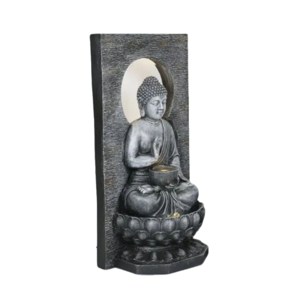 A truly spectacular piece, the Willow & Silk Radiant Buddha fountain features a large, contemplative Buddha figure with water cascading dramatically over the base, highlighted by integrated lighting for a radiant nighttime effect.