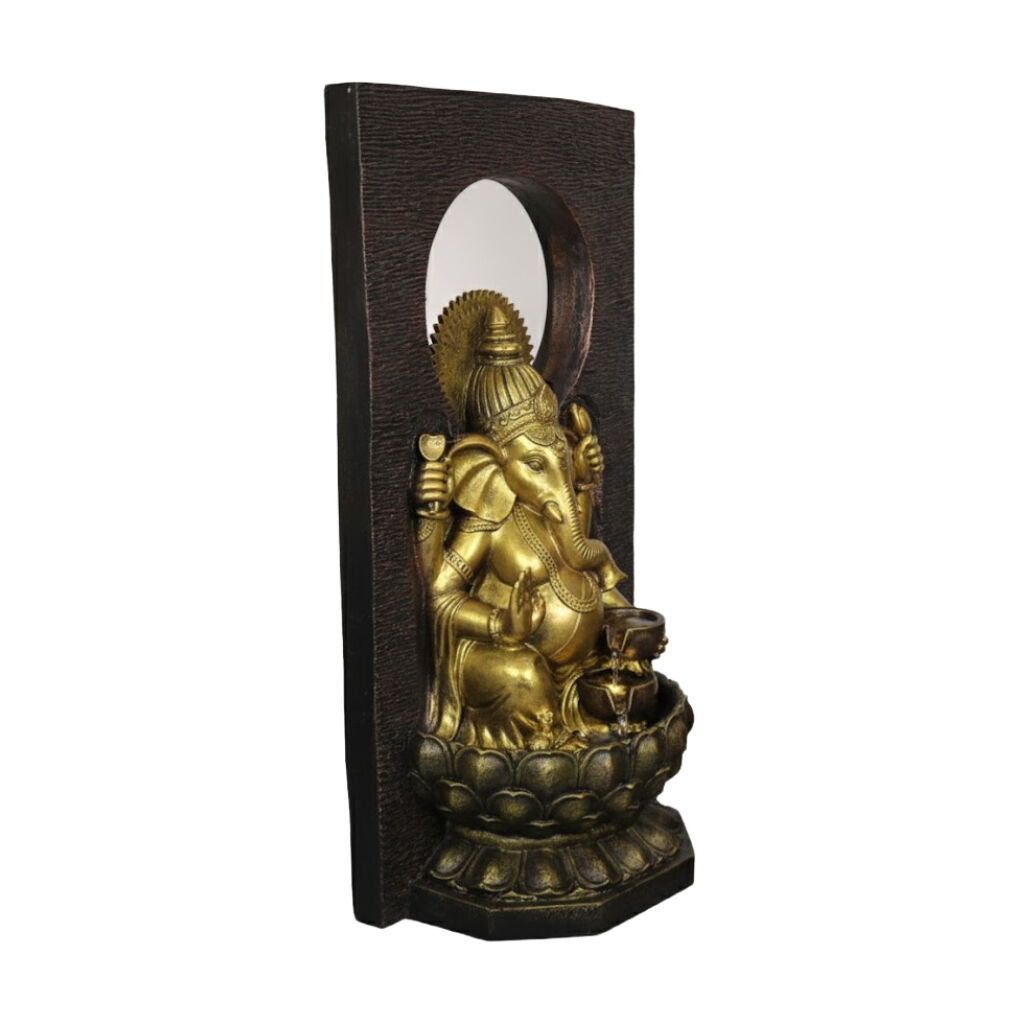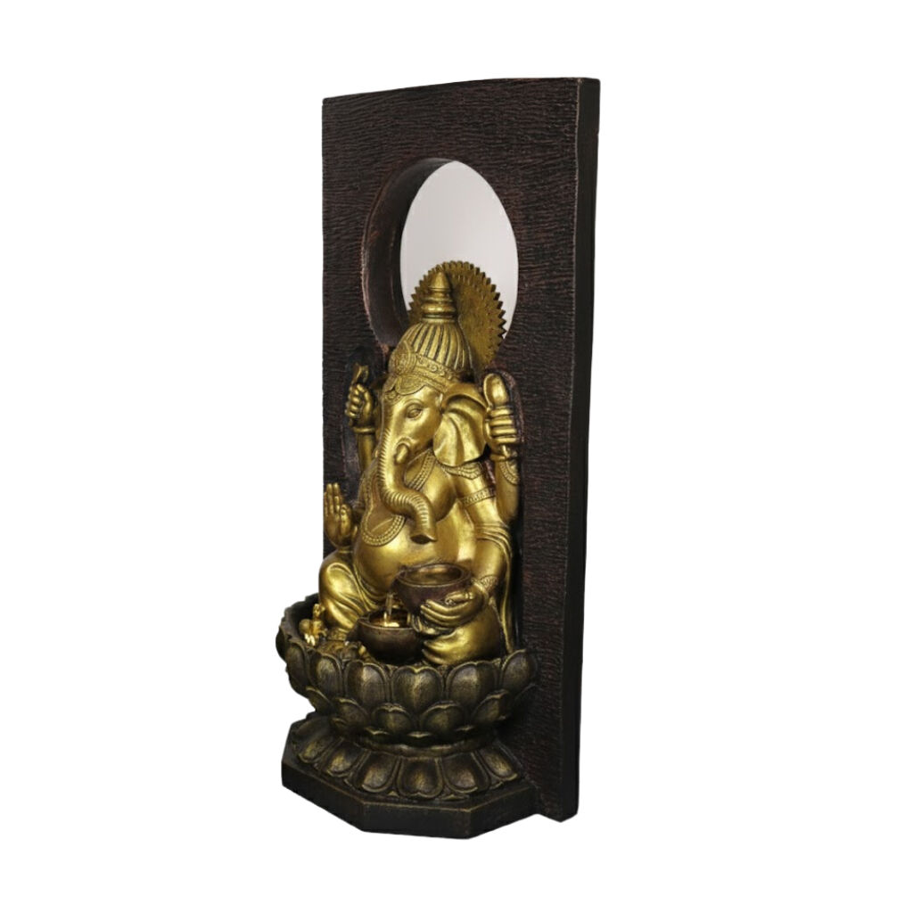 The magnificent Willow & Silk Radiant Ganesha fountain features a large, highly detailed Ganesha figure, the Hindu deity of wisdom and success. Water flows gracefully over the figure, illuminated by lights, creating a powerful, spiritual focus.