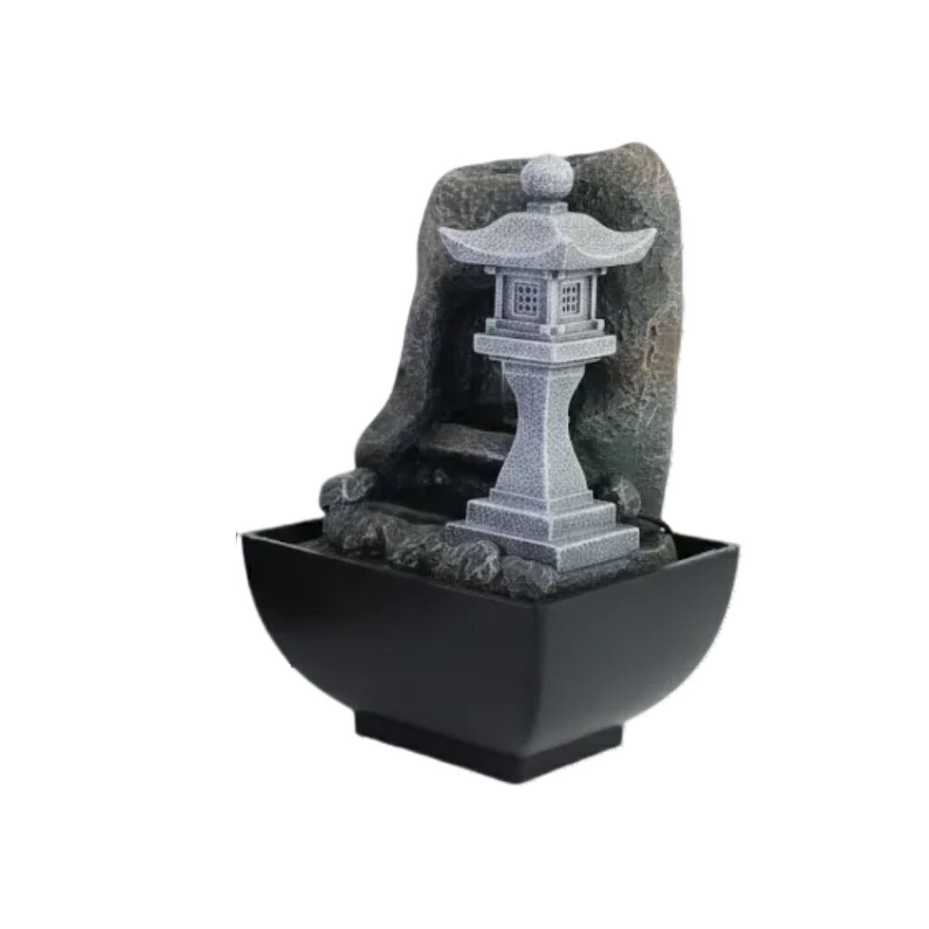 Capturing the classic beauty of Asian architecture, the Willow & Silk Raining Pagoda fountain features a miniature, multi-tiered pagoda structure. Water flows from the top, gently dripping down each roof level, creating a structured, rhythmic sound reminiscent of a soft, steady rain.