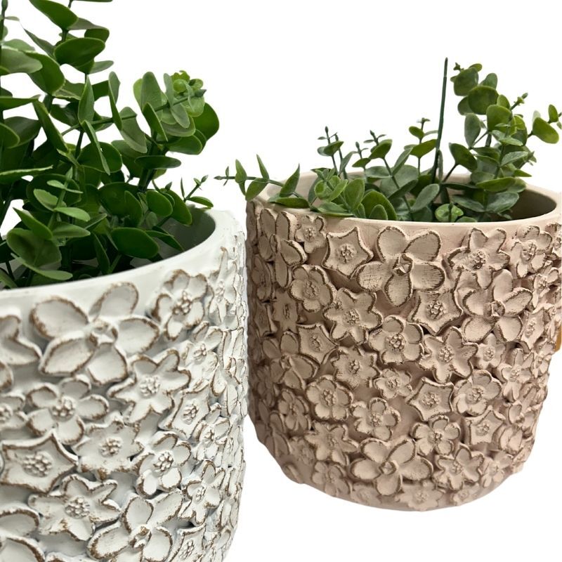 Elevate your home decor with our Set of 2 Assorted Flower Embossed Planters, featuring elegant white and dusky pink ceramic cups adorned with delicate floral designs. Each planter is thoughtfully designed with a drainage hole and plug, ensuring optimal plant health while adding a touch of sophistication to any space. Perfect for showcasing your favorite flowers or greenery, these planters seamlessly blend style and functionality, making them an ideal choice for both indoor and outdoor settings. Transform your living area into a botanical haven with this charming set.