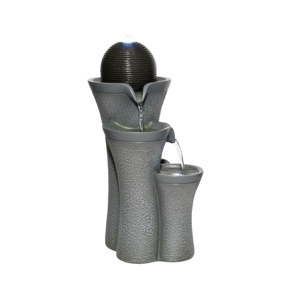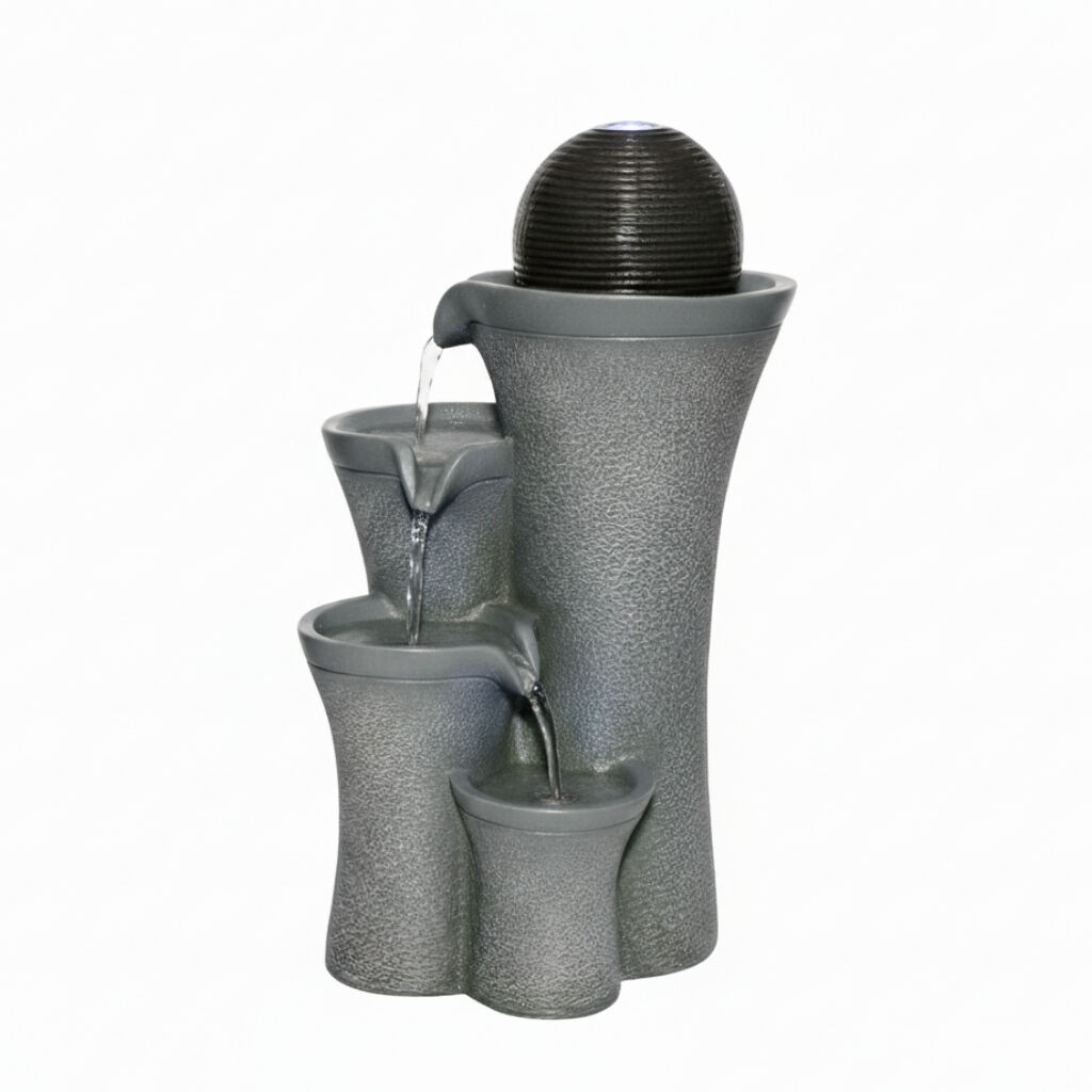 The Willow & Silk Sphere Vase Cascade fountain is an artistic vertical piece featuring a spherical vase at the top, from which water overflows and runs down a textured base. It's a dramatic yet graceful accent.