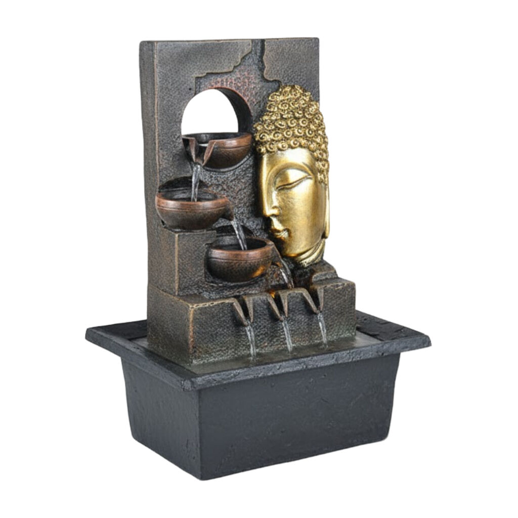 The Willow & Silk Terracotta Buddha fountain features a serene Buddha figure with a warm, earthy finish that mimics classic terracotta. The water gently flows over the textured surface, blending tranquility with a rustic aesthetic.