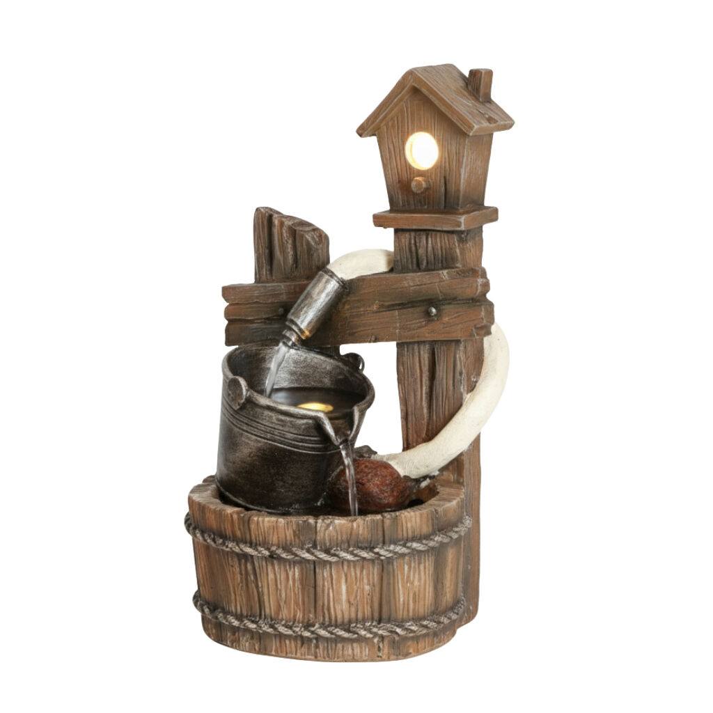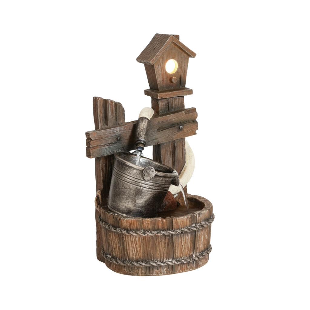 The whimsical Willow & Silk Water Hose Bird Nest fountain features a clever design where a hose appears to spray water onto a bird and its nest. It's a fun, playful piece that brings a lighthearted touch of wildlife to your decor.