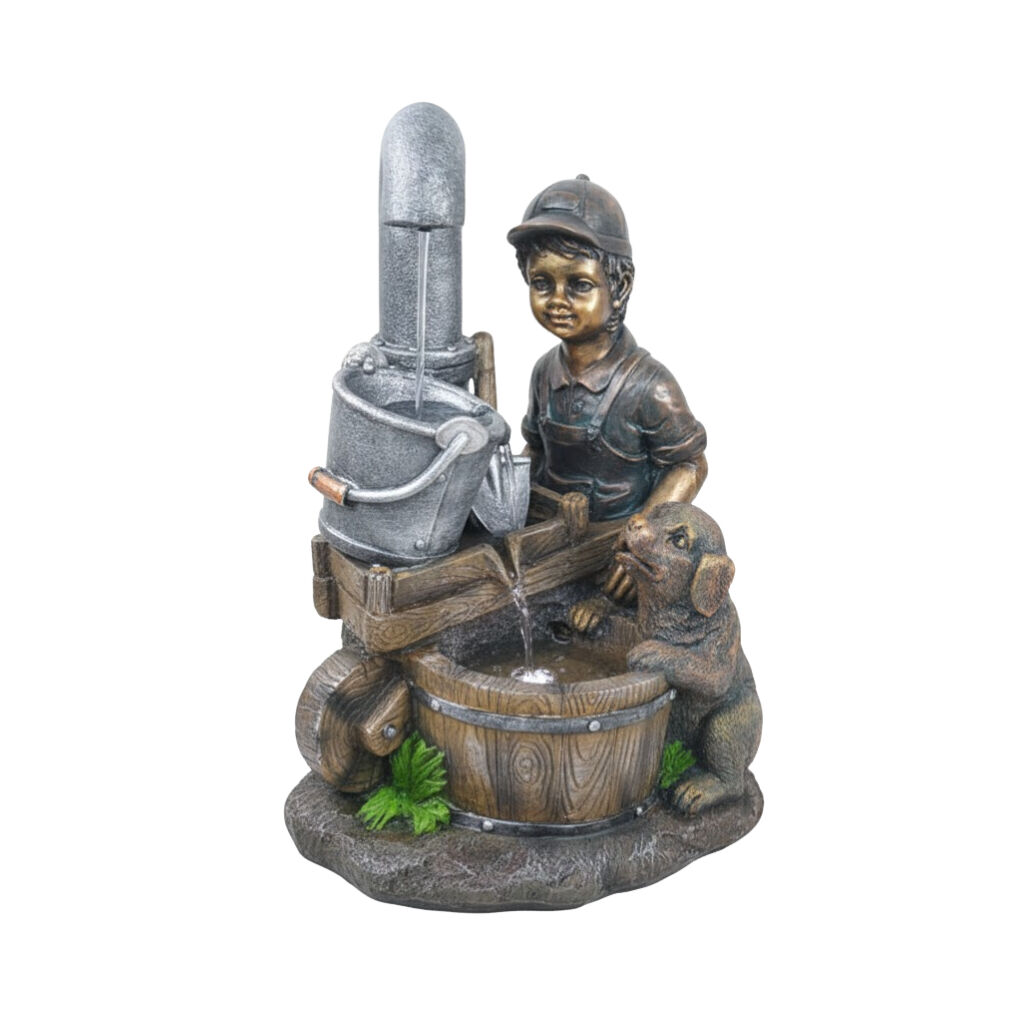 This heartwarming Willow & Silk Wheelbarrow Puppy fountain features a cute puppy resting in a miniature wheelbarrow, with water gently spilling from the barrow. It's an ideal piece for adding friendly, farm-style character.