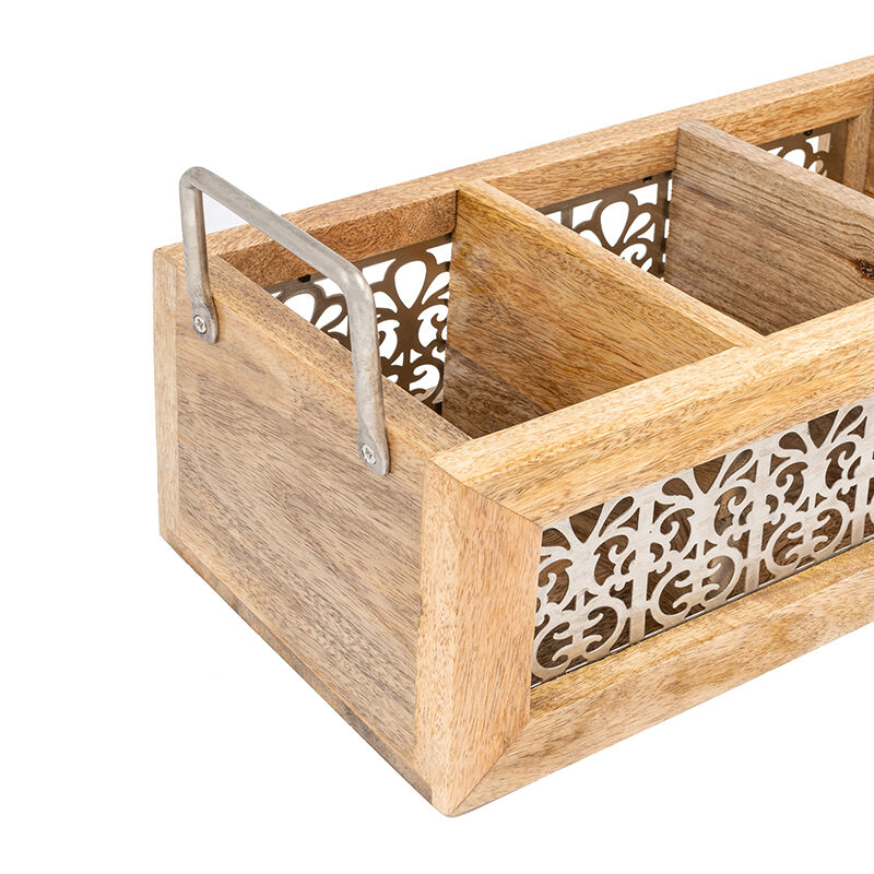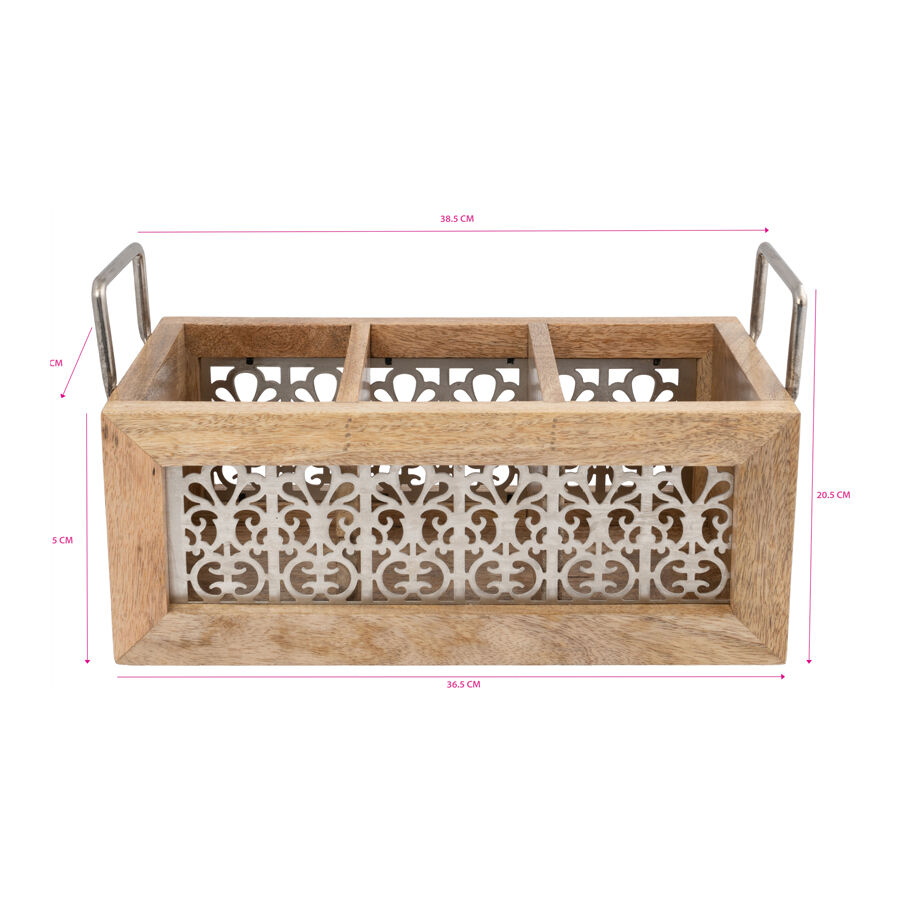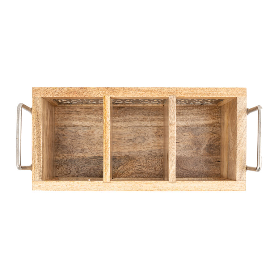 Bring practicality & charm to your kitchen or dining space with our Handmade Wooden Metal Cutlery/Storage Caddy 3-Division. Organise your cutlery, utensils, and other small items stylishly. This caddy's natural but modern look blends seamlessly with other decor items.